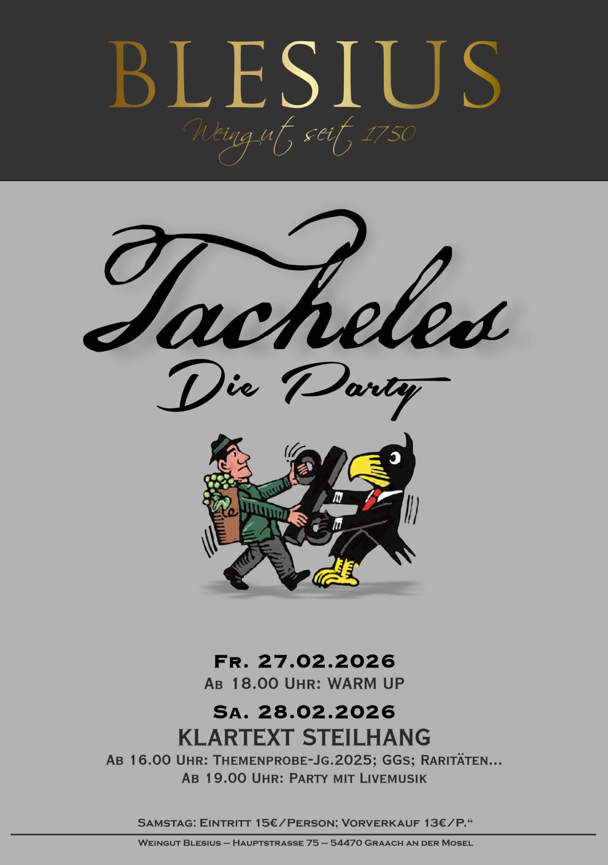 Unter dem Motto „Tacheles – Die Party“ laden wir herzlich zu einem Wochenende voller Wein, Musik, Geselligkeit und moselländischer Lebensfreude ein.